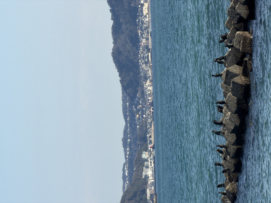 A coastal scene shows a concrete breakwater extending into the ocean, dotted with resting black birds. The calm, rippling water reflects the sky. A coastal town and verdant mountains are visible along the shoreline in the distance. A clear sky occupies the upper portion of the frame.