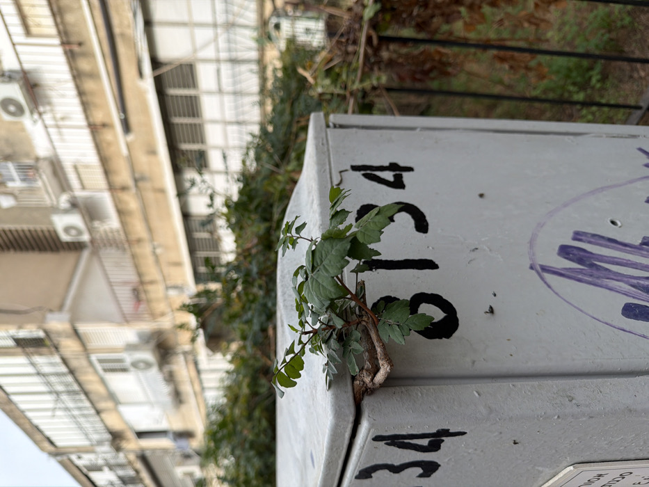 The scene presents a weathered, light-grey utility box in an urban setting in Holon, Israel. A small green plant, approximately 15-20 cm in height with multiple stems and compound leaves, is growing from a crack in the top-left edge of the box's lid, with a woody root structure visible. The front of the utility box features black numbers, '34' on the left side and '8134' on the right, which appear stenciled or hand-painted. A circular purple graffito is partially visible on the lower right portion of the box's face. Behind the box, a dark metal fence with vertical bars is partially obscured by dense green and autumnal brown foliage. In the blurred background, a multi-story residential building with a light-colored facade, multiple windows with white shutters, and external air conditioning units is visible. The sky is overcast.