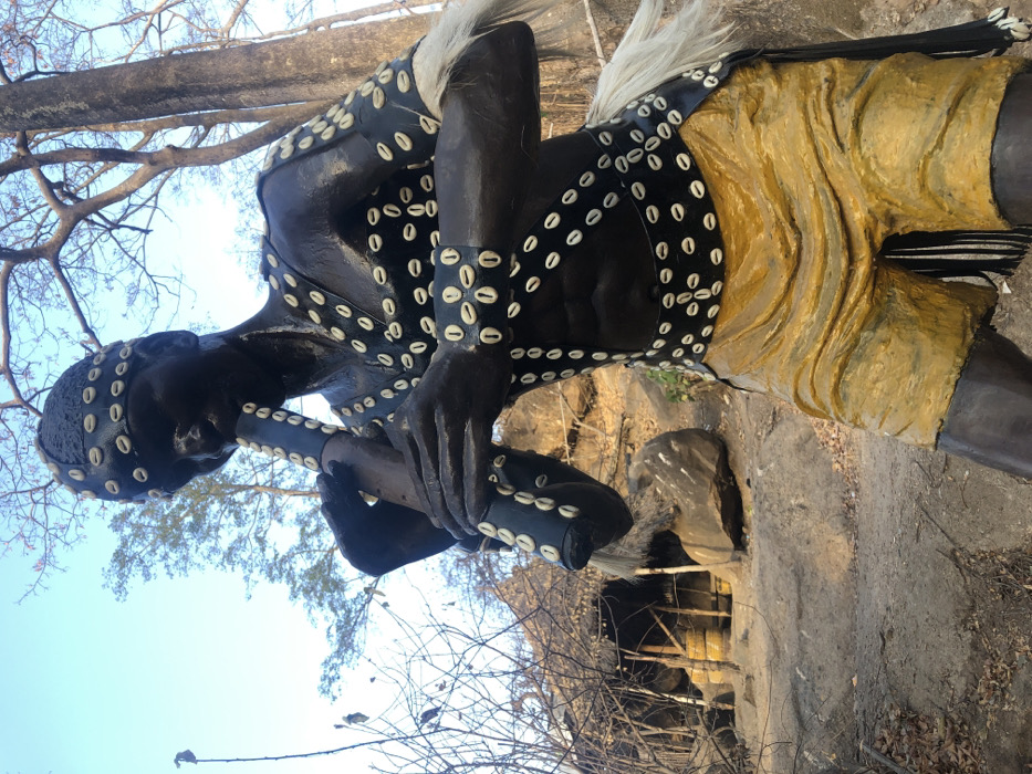 A dark-skinned, possibly wooden, statue stands outside. The figure is adorned with cowrie shells outlining a dark, sleeveless garment and encircling its head and a tube-like object held to its mouth. Yellow, draped shorts and white hair complement its attire. The statue is set against a backdrop of trees, a rocky landscape, and a glimpse of a rustic structure. The image is taken from a low angle and rotated.