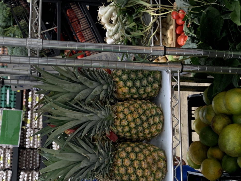 A commercial shelving unit displays assorted produce. Three pineapples with green leafy tops fill a white shelf. Above, there are other shelves with tomatoes, onions, and leafy greens. To the right of the pineapples, a basket holds green citrus fruits. Other shelves in the background contain items like eggs. The perspective is from a low angle, looking slightly upward at the produce.