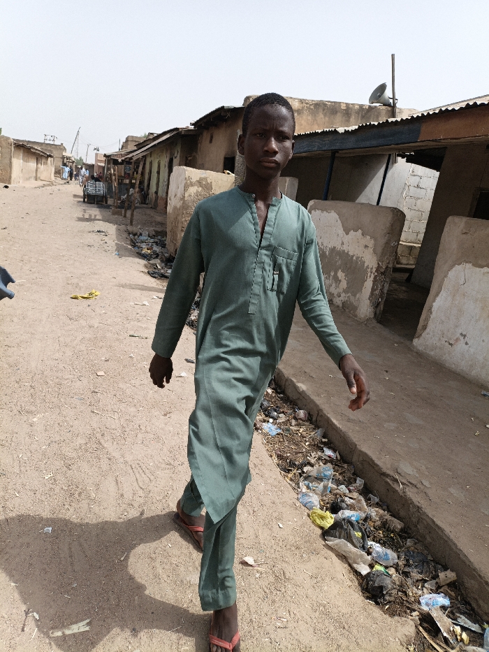 The scene depicts a young male walking on an unpaved dirt road in Zango, Nigeria