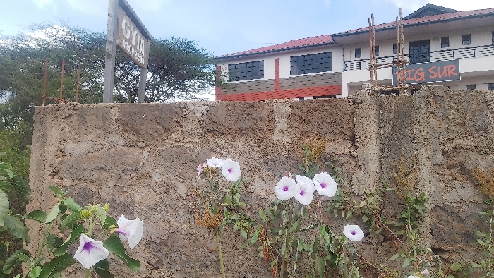 The scene is set outdoors in Nkaimurunya ward, Kenya, and is framed by a rough, unpainted concrete or stone wall that occupies the lower half of the image. Numerous white flowers with purple centers, resembling morning glories, grow from the base and along the surface of the wall, intermingled with green foliage and some dry brown plant stalks. Above the wall, a two-story building with a light-colored facade and a red-tiled roof is visible. The building features multiple dark-paned windows, some with horizontal grilles, and a distinct horizontal band of orange-red brickwork or tiling on its lower section. To the left, a weathered wooden sign mounted on a post displays the word "GYM" prominently, with "MOZZAH" partially visible beneath it. To the right of the building, an orange sign with the text "BIG SUR" is affixed to a structure. Adjacent to the "BIG SUR" sign, exposed rebar protrudes upward, indicating an unfinished concrete element or structure. Mature green trees are visible behind the building and signs. The sky above is clear light blue with minimal cloud cover. No people are present in the image.