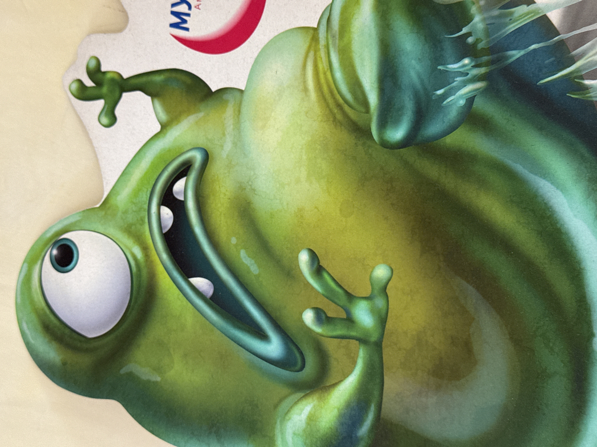 The image displays a close-up section of an advertisement or poster located in Razlog, Bulgaria. The central subject is a large, cartoon-style, green, blob-like creature with a textured, glossy, and somewhat slimy appearance. Its single visible eye features a white sclera, a teal iris, and a black pupil, directed upwards and to the right. The creature's mouth is wide open, exposing two small, white, pointed upper teeth and thick, teal lips, indicative of a surprised or distressed expression. Two three-fingered limbs are depicted: one is raised on the upper right side, and another extends from the lower left portion of its body. A translucent, light-colored, viscous substance drips in multiple streams from the creature's lower right body segment. In the upper right background, behind the creature, a fragment of a red crescent-shaped logo is visible, alongside partially obscured Cyrillic text reading 'МУ' and 'Ат'. The background of the poster itself is a plain, light-colored, textured surface.