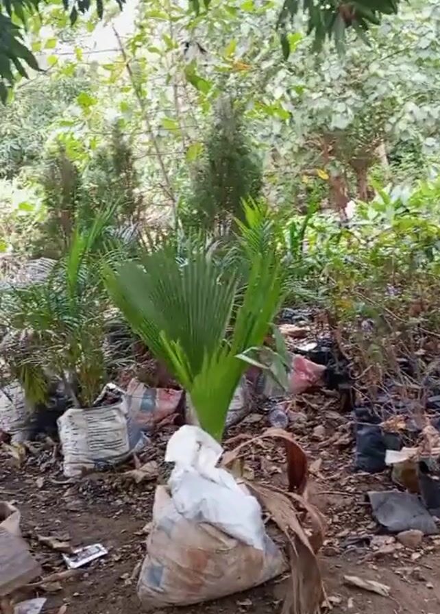 small outdoor plant nursery. A variety of plants in bags and pots are scattered on the ground, including small palm trees and various leafy bushes. There are also several large bags filled with an unidentified substance. The ground is covered with fallen leaves and debris. The nursery is located under the shade of several mature trees with dense foliage. A glimpse of a wooden structure, possibly a bench, is visible in the lower left corner of the frame.