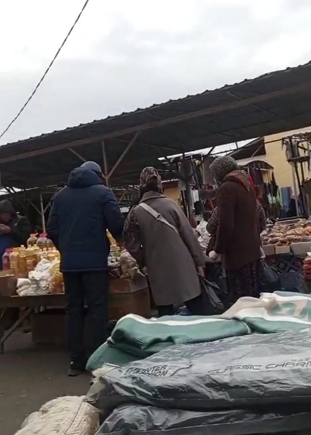 n outdoor market with various stalls under a covered area. People are walking around, some browsing goods on display. The stalls appear to be selling a mix of items, including food items like oil, nuts, and dried goods, as well as textiles such as fabrics and scarves. The sky is overcast. Some people are carrying shopping bags. The ground appears to be a mix of concrete and dirt. The overall atmosphere suggests a busy local market.