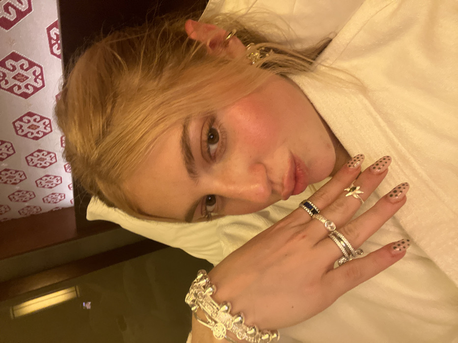 The image displays a close-up, warm-toned selfie of a young adult female in what appears to be an indoor setting, likely a hotel room. The specific location within Wulingyuan, China, is not discernible from the visual information provided. The female subject has blonde hair, pulled back from her face with some strands framing her forehead. Her eyes are light brown, and her cheeks show a pink flush. She is looking directly at the camera with a pouting expression. She is clad in a white terry cloth bathrobe. Her left hand is positioned in the foreground, showcasing multiple pieces of jewelry and her manicured nails. Her left wrist is adorned with several silver-toned bangles, some featuring intricate designs or charms. On her left hand, she wears a thick silver-toned ring with a clear or white stone on her index finger, a silver-toned ring with a dark blue or black enamel band on her middle finger, and a silver-toned ring with a small, five-pointed star or floral motif on her ring finger. Her fingernails are painted with a light base and a pattern of dark brown or black polka dots. The subject's right ear is partially visible, displaying multiple gold-toned hoop earrings or ear cuffs. The background consists of a white pillow, a dark brown headboard or wall panel, and a wall or headboard section featuring a repeating pattern of white and red/maroon hexagonal designs on a lighter background. A faint reflection of a rectangular light source is visible on the far left in the background. The lighting is artificial and warm, consistent with an indoor environment.