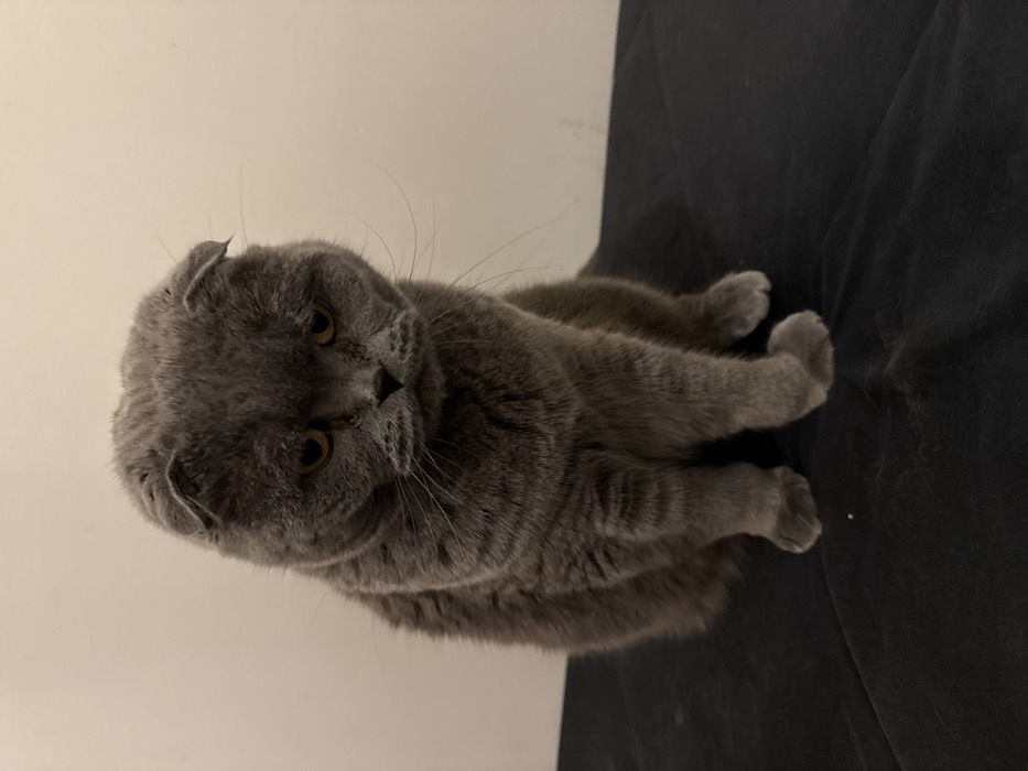 - "A gray Scottish Fold cat sits upright, facing the camera" by FM-bO7oP2, licensed under CC BY 4.0