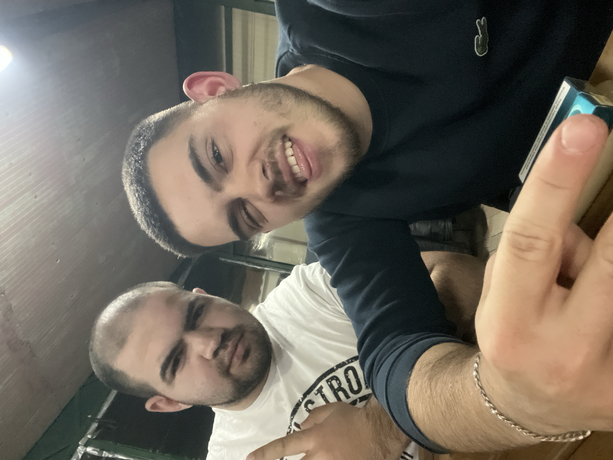 The image displays two adult males in an indoor setting in Strazhitsa, Bulgaria. The individual in the foreground, positioned to the right, is a young adult male with short dark hair, a beard, and dark eyebrows. He is wearing a dark blue long-sleeved sweatshirt featuring a green Lacoste crocodile logo on the left chest. His right eye is closed in a wink, and his tongue is partially extended. A silver chain bracelet is visible on his left wrist. His right hand is prominent in the lower foreground, holding a light blue and white rectangular object, identified as a cigarette pack. The second individual, positioned behind and to the left, is an adult male with a receding hairline, a beard, and dark eyebrows. He is wearing a white short-sleeved t-shirt with dark lettering visible across the chest, partially reading "STRO". He is looking towards the camera with a neutral to stern expression. His left hand is raised, forming a "V" shape with his index and middle fingers. The background is dimly lit, featuring dark, possibly green-tinted panels or walls on the left and a dark ceiling. A bright, unshielded light source is visible in the upper right portion of the frame. A wooden surface, possibly a table, is partially visible in the bottom foreground. The overall lighting suggests an artificial light source at night or in a poorly lit interior space.