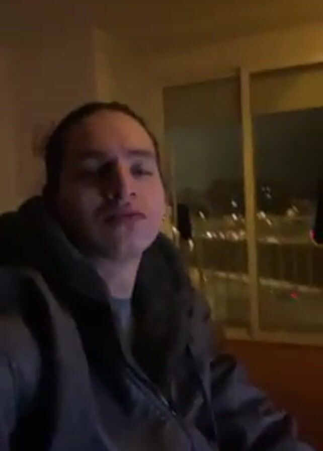 Here is a detailed description of the video: The video shows a person sitting indoors at night. The person appears to be male, has long dark hair pulled back, and is wearing a gray t-shirt under a dark jacket with a hood. The background includes a window with a view of city lights at night. The room is dimly lit. The person is looking at the camera with a neutral expression. There is a floral design on the wall and what appears to be clothing hanging near the window. The camera is relatively stable, capturing the person from the chest up.
