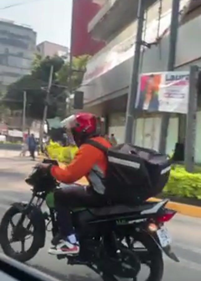 The video, recorded from inside a moving vehicle, shows a street scene in what appears to be an urban environment. Initially, a person on a motorcycle wearing an orange jacket, red helmet, and a large black delivery bag is visible to the side of the camera. The motorcycle is black with some green accents. As the vehicle proceeds, the focus shifts to the urban backdrop, revealing buildings of various heights, trees, overhead wires, and other vehicles including a white car and a red car. Pedestrians are also visible on the sidewalks. One building has a red cylindrical shape. A political poster featuring a woman named "Laura" is displayed along the street. The sky is clear and blue.
