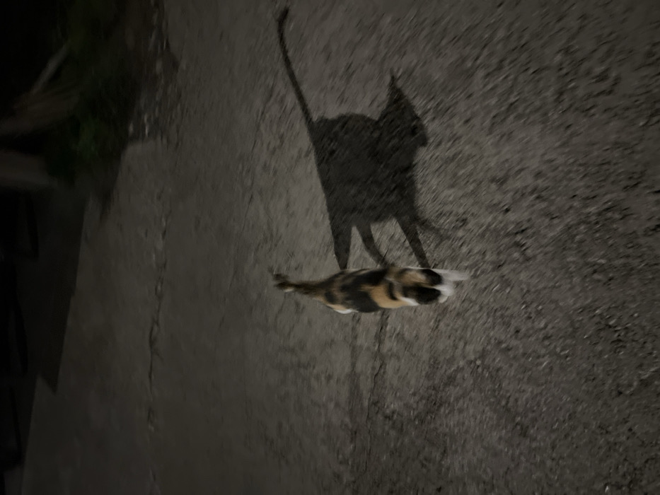 - "The image depicts a calico cat walking on a dark, textured paved surface, likely a street or pathway, in Rafailovići, Montenegro, during nighttime or low-light conditions" by FM-7ACUm1, licensed under CC BY 4.0