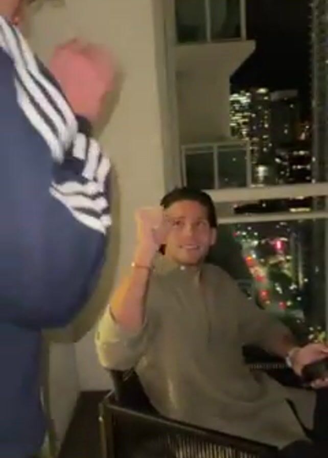 A video shows two people on a balcony at night. One man, wearing a dark blue Adidas track jacket, is standing and performs a double handclap. The other man, wearing a green shirt, sits in a black chair holding a phone and smiles. The camera pans to a wide shot of the city skyline at night with many lit buildings. The balcony has a white metal railing.