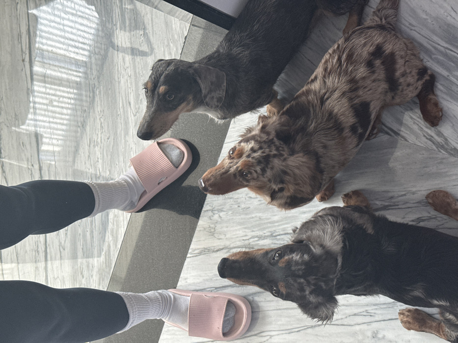 Three dachshunds, two dapple-colored and one predominantly black with dapple markings, surround a person wearing black leggings, white socks, and pink slide sandals