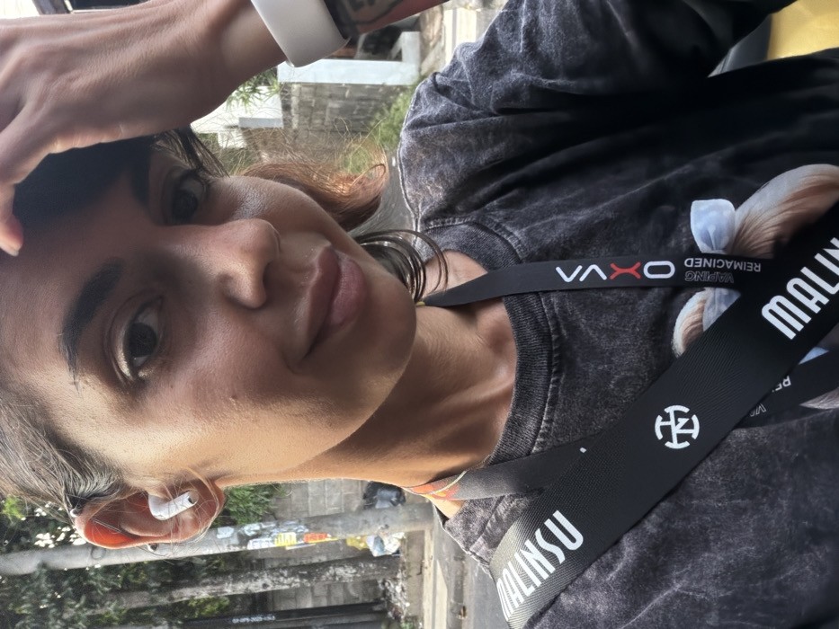 A female subject is depicted in a close-up selfie, positioned outdoors in Kuta, Indonesia. She has dark hair, dark eyes, and a medium complexion, exhibiting a slight smile. Her right ear contains a white wireless earbud, while her left ear features multiple thin dark hoop earrings and a silver-colored ear cuff on the upper helix. She wears a grey, faded t-shirt with a partially visible graphic print. A black lanyard crosses her chest, displaying white text including "MALINSU", a circular logo, and "VxXO VAPING REIMAGINED". A white wristband is present on her right wrist, with a tattoo visible beneath it on her forearm. Her right hand is raised, touching her head/hair on the right side of the frame. The background, out of focus, shows an urban environment with a utility pole adorned with posters and lush green trees on the left, and a light-colored concrete wall or building with further foliage on the right. The scene is illuminated by bright daylight.