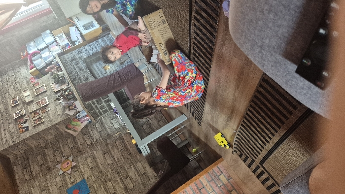 This image captures an indoor residential scene, specified as being in Melle, Belgium. Three children are present in a room featuring light-toned faux stone wall paneling on the right, contrasted with a brick wall section on the left. The floor is comprised of wooden planks partially covered by two rectangular dark brown and beige striped rugs. In the center-midground, a young girl, wearing a multi-colored floral dress with her dark hair in a ponytail, is seated on one rug, facing away from the viewer. She is positioned next to a large cardboard box. Inside this box, a young child or toddler, wearing a red long-sleeved shirt and light trousers, is seated and looking directly towards the camera. To the right and slightly behind the box, another young girl, wearing a blue and white patterned dress, is partially visible, also looking towards the camera. In the background, a light-colored rectangular table with a dark chair and a purple fabric-covered chair are visible. A fireplace mantel below a collection of framed pictures and decorative items is against the faux stone wall. A window on the far right allows natural light into the room. On the left wall, a yellow sun-shaped decoration and a blue art piece are affixed. A yellow toy vehicle is on the floor to the left, and a small green ball is near the dark chair. The bottom right foreground shows a portion of a grey fabric surface, likely a sofa or lap, with a remote control partially visible.