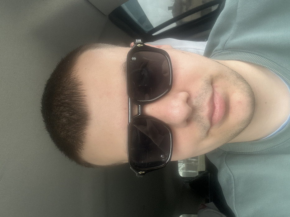 The image depicts a close-up, front-facing portrait of a male individual positioned inside a vehicle. The subject occupies the majority of the frame, looking directly towards the camera with a neutral to slightly smirking expression. He has fair skin, a short, dark brown buzz cut haircut, and a minimal amount of stubble on his chin and upper lip. He is wearing dark, square-framed sunglasses with thick black frames, obscuring his eyes. A distinctive silver-colored emblem, possibly a crest or logo, is visible on the upper outer corner of the left lens, and a small gold-colored accent is present on the temple of the right frame. The individual wears a light teal or mint green long-sleeved top, with a lighter blue collar visible underneath. The background elements are consistent with the interior of a car. A dark gray headliner or roof lining is visible above the subject's head. On either side, blurry reflections and views through tinted car windows suggest an outdoor environment. The left window shows indistinct light-colored shapes and dark, possibly skeletal tree branches against an overcast sky. The right window reveals a faint, blurred outline of what appears to be a building or structure with a light-colored roof or upper section against a similar sky. The specific location within Ruse, Bulgaria, is not discernible from the visual evidence.
