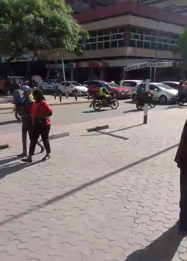 n urban street scene during daylight. There are several people walking and riding motorbikes. Two people are walking along a sidewalk with a distinctive wave pattern. A man in a dark jacket walks towards the camera. Several motorbikes, some carrying passengers, are driving in the street amidst cars. The street is marked with pedestrian crossings. The buildings in the background are tall and modern. One building has a sign that appears to say "KENYATTA AVENUE". The overall atmosphere appears to be busy and urban.