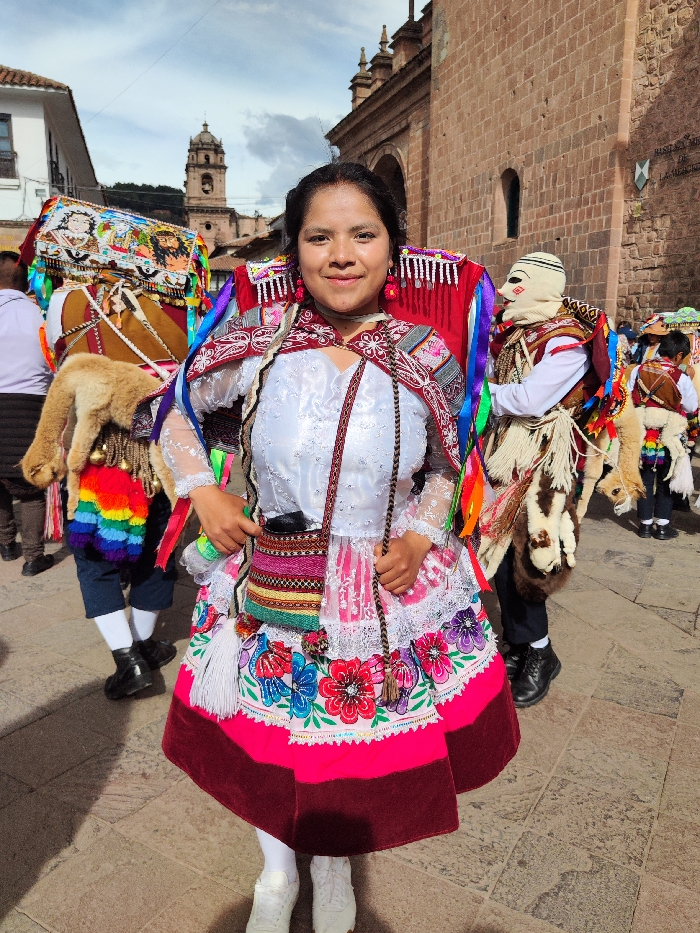 - "A smiling woman in traditional Andean clothing stands in a town square" by FM-20kwN2, licensed under CC BY 4.0