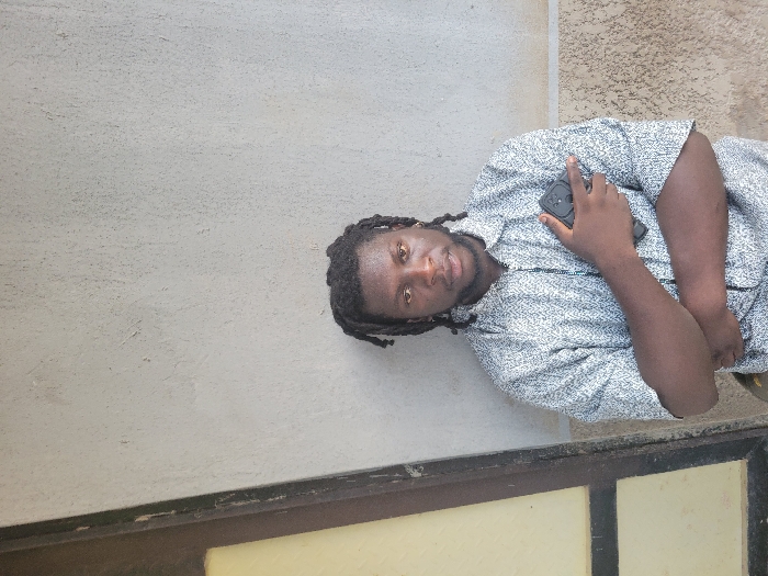 The scene is located in Makurdi, Nigeria. A male individual of African descent, with dark skin, short dreadlocks, and a beard, stands centrally against a textured, light-grey wall. He wears a short-sleeved, collared shirt with a speckled light and dark pattern, featuring a central zipper closure. A small earring is visible in his left ear. He holds a black smartphone in his left hand against his torso, with his arms crossed. The phone's rear camera module is visible. To the individual's left, a dark brown or black frame with an internal yellow or beige panel, consistent with a door or window frame, is partially visible. The individual faces the viewer directly.