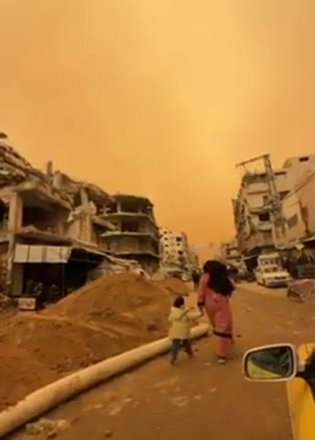 street in a war-torn city under an orange sky. A woman and child walk down the center of the dirt street. The buildings on either side of the street are partially destroyed with debris visible. A pile of sand is to the left of the street with a white pipe running along the edge. Several people are walking in the distance. The side mirror of a yellow vehicle can be seen in the right foreground.