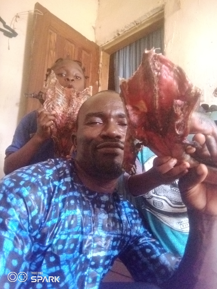 The image captures three individuals in an indoor setting. An adult male with dark skin and a short beard occupies the central foreground, looking towards the camera with a faint smile. He is dressed in a blue and black patterned long-sleeved garment. His left hand holds a reddish-brown, irregularly shaped object, identified as a dried or smoked animal product, possibly a fish head or a section of meat. Behind him, to the left, a child with dark skin and braided hair holds a dried or smoked fish skeleton, showcasing its rib cage and head section, positioned near their face. To the right and behind the man, a third individual, partially visible, wears a light blue t-shirt with a graphic design and assists in holding the lower part of the object held by the man. The background features a light-colored, somewhat worn wall, with a wooden door frame on the left and a window covered by a light-colored patterned curtain on the right. A 'TECNO SPARK' watermark is present in the lower-left corner. The specific location within Ajaokuta, Nigeria, is not discernible from the image content.