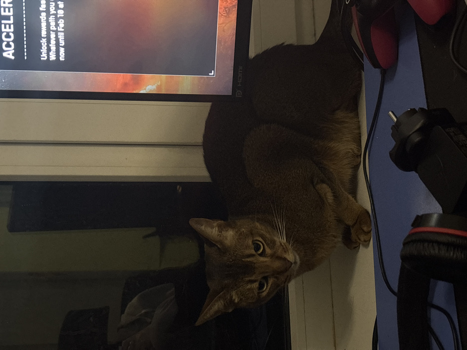 - "A brown Abyssinian cat sits near a computer monitor displaying text "Unlock rewards faster" by FM-C8vAX2, licensed under CC BY 4.0