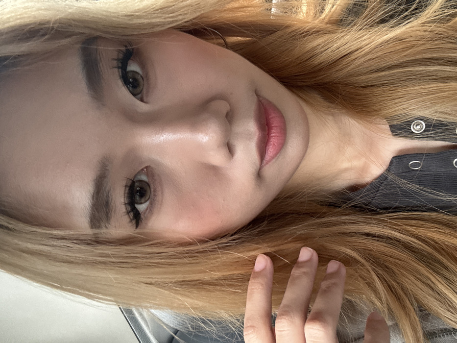 A close-up, front-facing selfie depicts an East Asian female
