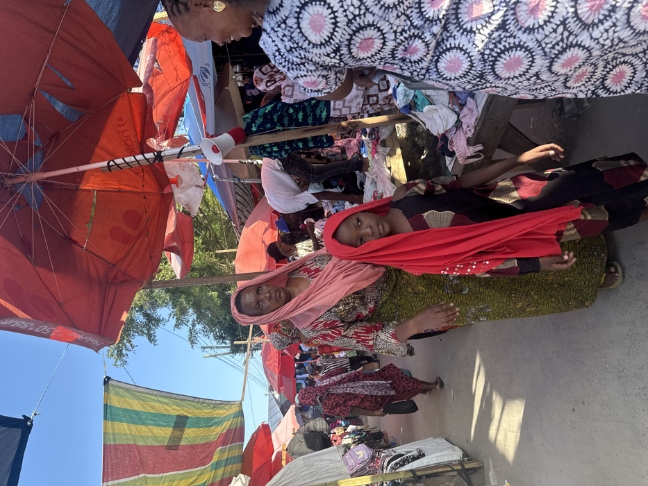 At an outdoor market, two women are prominently displayed. One woman wears a light pink headscarf and a green patterned dress. Beside her, a younger woman in a red headscarf and dark dress is also visible. Red umbrellas, some with advertising, shade the area. A megaphone is attached to one umbrella. Other people and merchandise are scattered around, creating a bustling market atmosphere.