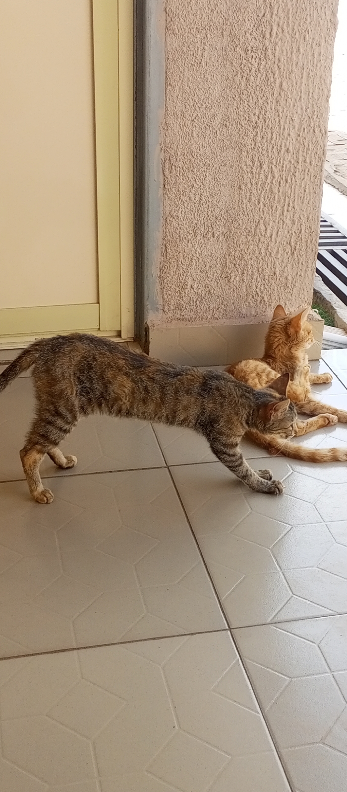 A tabby cat stretches on a tiled floor in front of a building. Another orange cat lies behind the stretching tabby, resting against a textured wall. A door frame is visible to the left. The tiles are light-colored with a geometric pattern. The stretching cat is dark with mottled brown and black markings. The scene is illuminated by natural light.