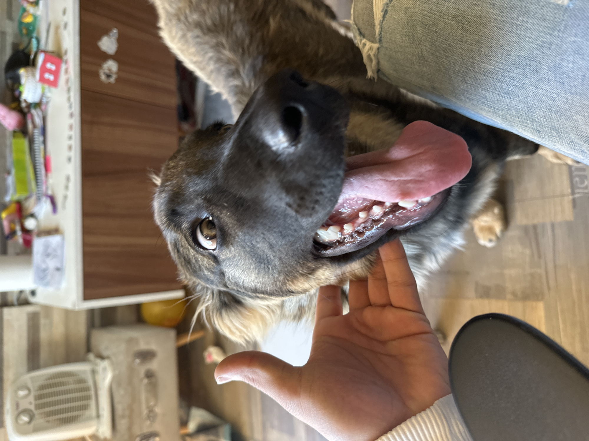A close-up photograph shows a gray and tan dog with its mouth open, revealing its pink tongue and teeth. A human hand is positioned beneath the dog's jaw. The dog is facing the camera with one eye visible. The background includes a wooden cabinet, a white shelf with various items, a white space heater, and blue denim fabric. The location is the city of Bankya, Bulgaria.