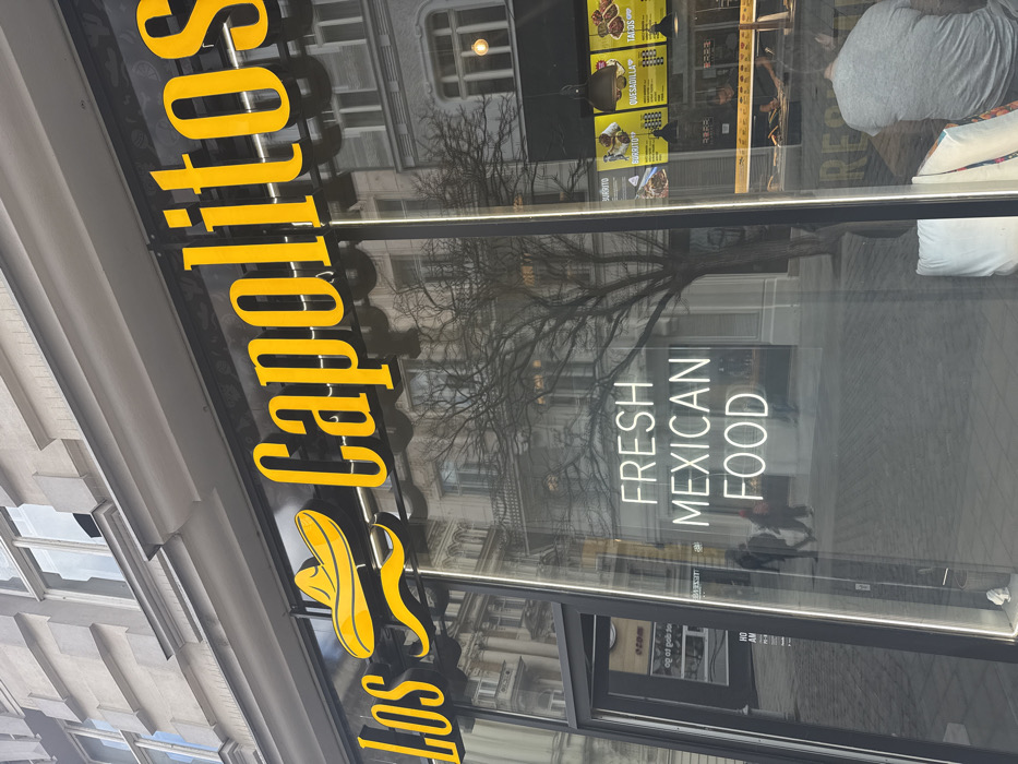 The image displays the street-level facade of "Los Capolitos," a Mexican restaurant located at Panská 390/3, 602 00 Brno-střed, Czechia. The restaurant's name is prominently featured in large, yellow, dimensional lettering, accompanied by a stylized yellow sombrero graphic. Below this, a white neon sign, oriented vertically, spells out "FRESH MEXICAN FOOD" in three lines. The facade is predominantly large glass windows, which reflect the external urban environment. These reflections distinctly show a bare deciduous tree with a complex branch structure, grey cobblestone pavement, and the upper portions of multi-story buildings with traditional European architecture, including numerous windows and decorative cornices. Two indistinct human figures, appearing as silhouettes, are visible in the reflection, walking on the pavement. Inside the restaurant, visible through the glass, a menu board on the right displays food items such as "BURRITO," "QUESADILLA," and "TACOS." Industrial-style pendant lights hang from the ceiling. A male individual, wearing a grey t-shirt, is seated at a table on the right side of the interior, facing away from the camera. A white object, possibly a cushion or bag, rests on a seat in the immediate foreground inside the establishment. Further inside, other patrons or staff are faintly visible. The scene is illuminated by natural daylight.