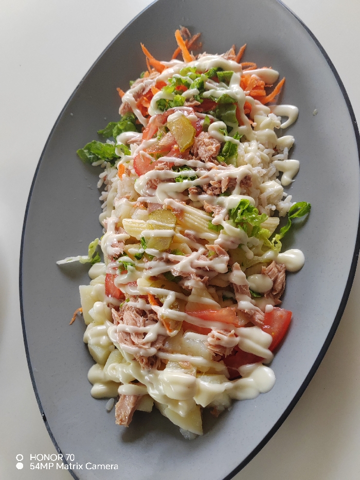 A gray plate presents a vibrant salad. Shredded carrots top rice, mixed with lettuce, diced tomatoes, and what appears to be pasta or sliced potatoes, creating a layered composition. Flakes of tuna are sprinkled across the dish, which is generously drizzled with a white, creamy sauce. The plate is boat-shaped and sits on a white surface.