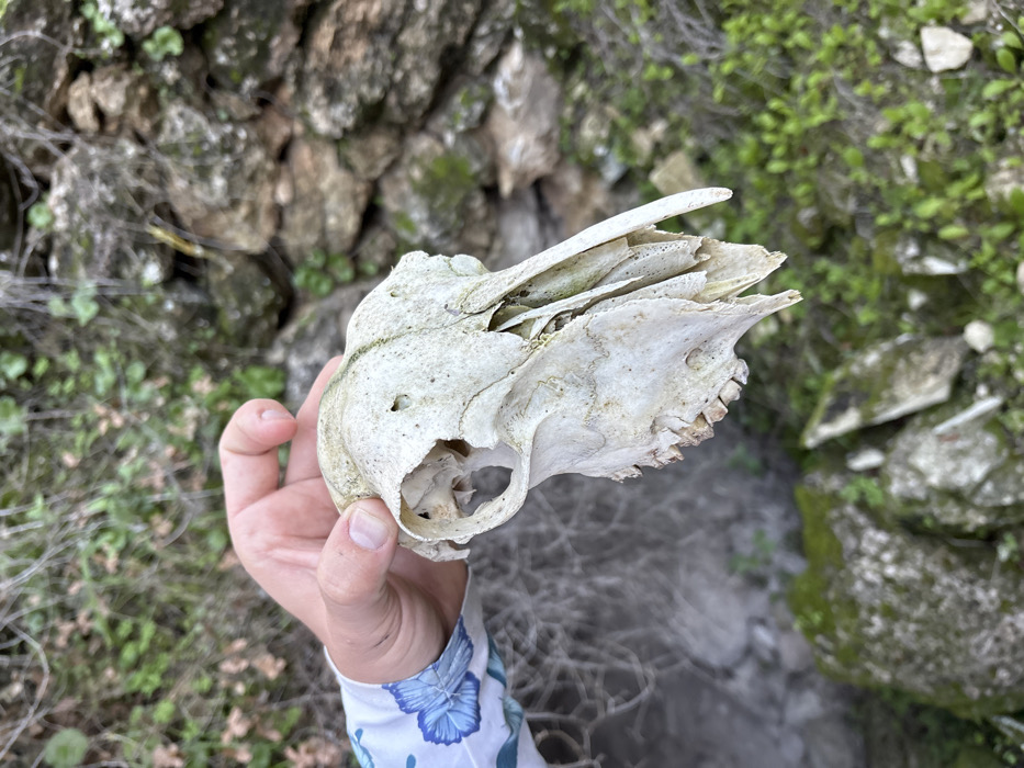 A light-skinned human hand, partially obscured by a blue and white patterned long-sleeved shirt, holds an aged, off-white animal skull in the foreground. The skull, likely from a herbivore, exhibits weathering and missing bone fragments, particularly around the nasal cavity and the absence of a lower jaw. The scene is set outdoors in a natural environment within Yoav Regional Council, Israel. The background features a blurred stone wall on the right, covered in green moss and small plants, suggesting an old or rustic construction. To the left and bottom, more blurred natural elements are visible, including dry, dark vegetation and moss-covered rocks, indicating a somewhat overgrown or wild terrain.