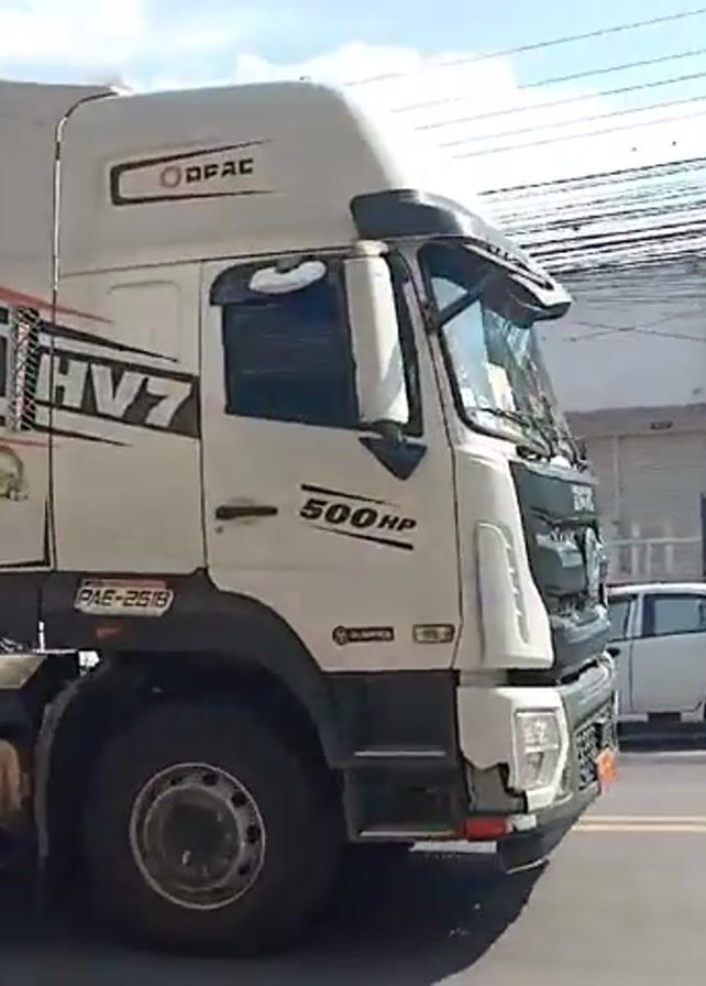 A large white DFC truck with an attached black trailer is moving along a road. The truck has "HV7" and "500HP" printed on the side. Other vehicles and buildings can be seen in the background. The trailer has "INICIAR CARGA" written on it, and a black Kia SUV passes behind the truck. The truck has a license plate reading PCE-2618. The Kia's license plate reads PDC-3897. The trailer is covered in some sort of substance or marks.