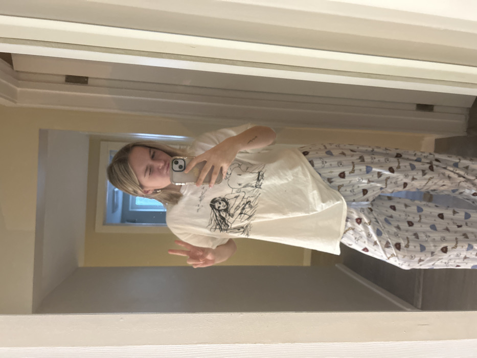 A blonde woman takes a mirror selfie. She wears a white T-shirt with a dark drawing and patterned pajamas. Her phone is in her right hand and she makes a kissy face. Her left hand makes a peace sign. A bathroom hallway is visible behind her. A doorway and a window illuminate a glimpse of another room.