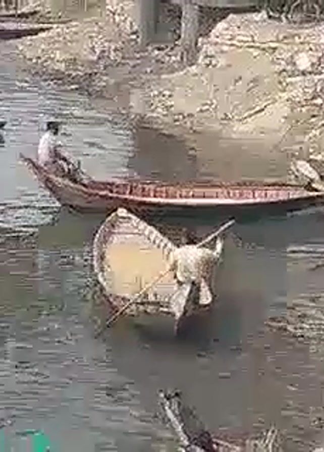 three men in wooden boats navigating a narrow river