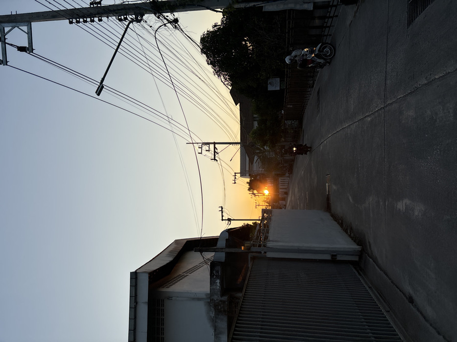 This image depicts a street scene at sunset within Chiang Rai City Municipality, Thailand. A paved two-lane road extends into the distance, illuminated by the low sun positioned directly ahead, casting long shadows. The sky transitions from a bright orange-yellow at the horizon to a pale blue overhead. On the left, a two-story concrete building with louvered vents is partially visible behind a tall, dark metal gate and a light-colored concrete wall. The right side of the street features multiple utility poles with dense bundles of overhead electrical and communication wires; a prominent pole in the foreground includes a streetlight fixture. Further down the road on the right, foliage and additional structures are visible. Two individuals on motorcycles are present. In the mid-ground, a dark-colored motorcycle with an illuminated headlight is moving towards the viewer; the rider is silhouetted. In the foreground on the right, a light-colored scooter-style motorcycle is stationary, positioned near a dark metal railing. Its rider, wearing a light-colored helmet, is seated on the vehicle.