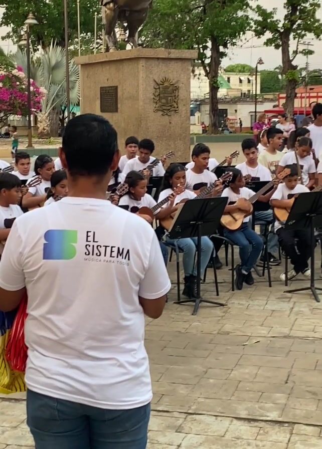 A video shows a youth orchestra playing in a public square. The orchestra consists of children, mostly preteens and teens, wearing white t-shirts and jeans, seated on black chairs in front of music stands, and playing instruments that look like small guitars. A statue of a man on a horse is visible in the background behind them. Two men stand facing the orchestra, conducting them. One man wears a white t-shirt that has the words "EL SISTEMA" printed on it with a colorful geometric logo. The other man wears a t-shirt with stripes of yellow, blue, and red, matching the flag of Venezuela. The men are conducting with their hands. The plaza is brick, and there are trees and buildings around the square. Several adults are watching the orchestra.