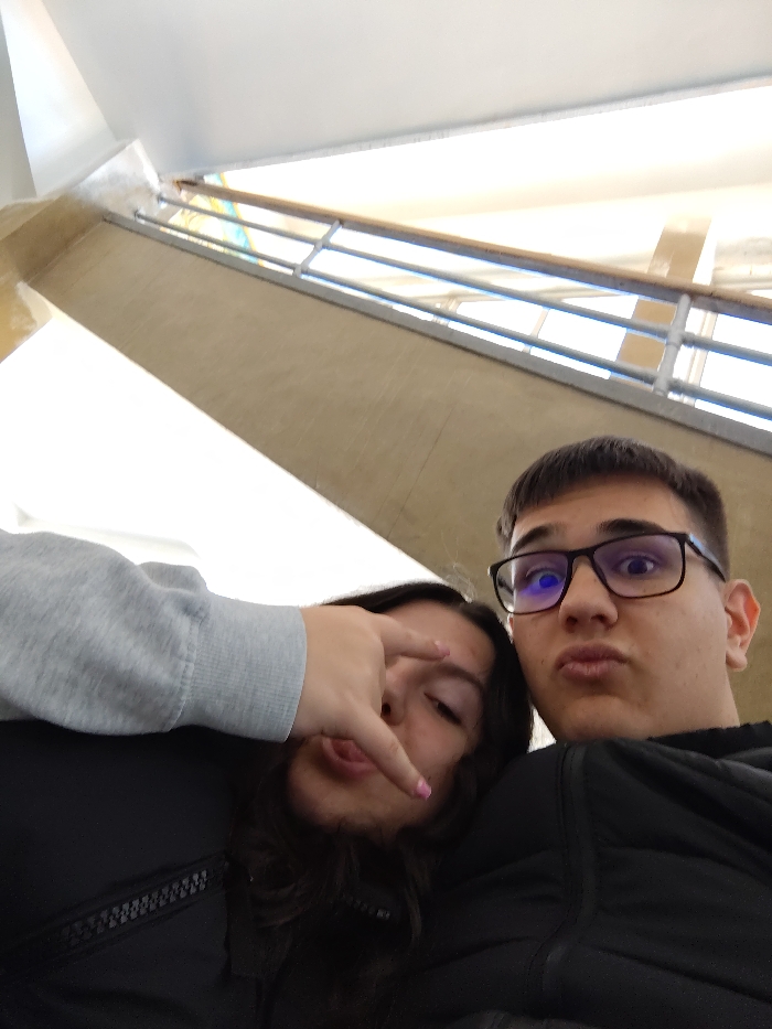 - "The image displays a close-up, low-angle selfie of two young individuals against a brightly lit indoor architectural background" by FM-gyP5C3, licensed under CC BY 4.0