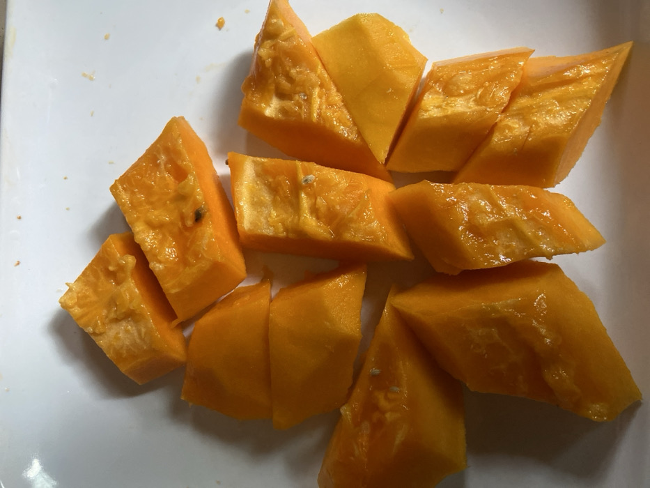 - "The image displays approximately fifteen to twenty irregularly shaped pieces of a bright orange-yellow fruit, likely mango or papaya, resting on a white, smooth surface, characteristic of a plate or serving dish" by FM-tWINy1, licensed under CC BY 4.0
