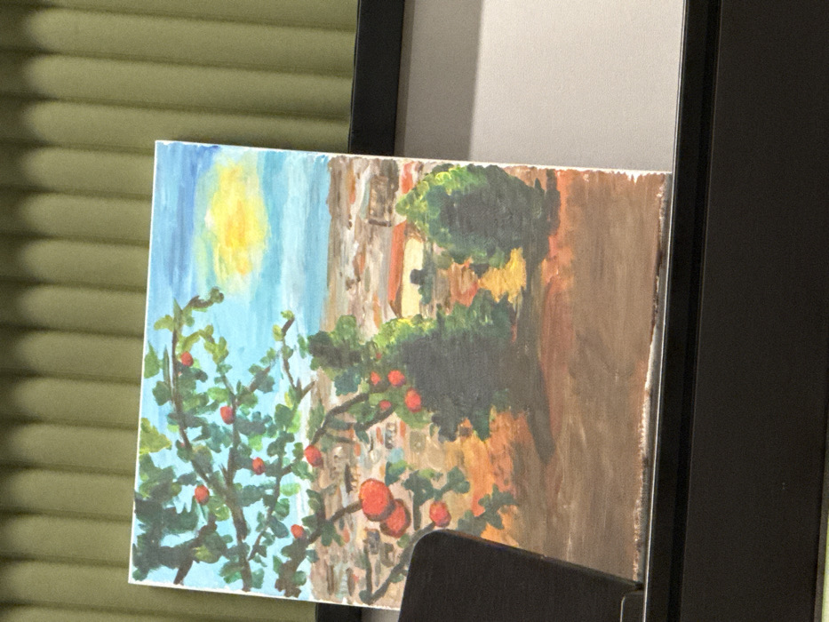 An oil painting depicts a sunny landscape with a tree in the foreground bearing red fruit. Blue sky and yellow sun fill the upper left corner. Behind the tree, a building with orange accents emerges from a shaded area. The right side of the painting transitions into a brown and earthy tone, possibly representing a hillside or shadow. The painting is on canvas, likely framed, visible behind a black structure.