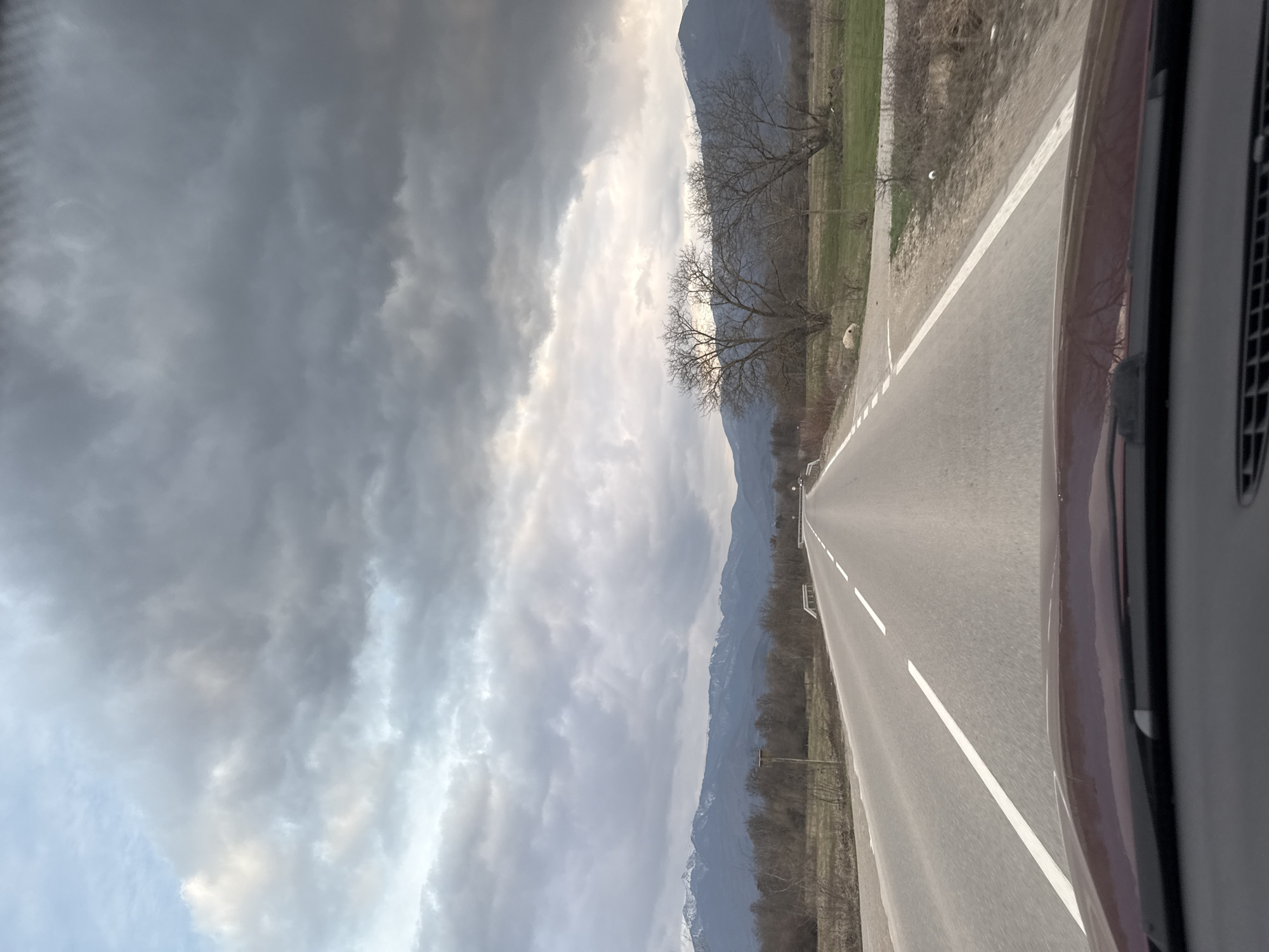 The image presents a forward-facing view from inside a stationary or moving vehicle on a paved road in Mezdreya, Bulgaria. The bottom portion of the frame shows the dark grey dashboard and the maroon hood of the vehicle. A two-lane asphalt road, marked with a broken white center line and a solid white line on the right shoulder, extends straight into the distant horizon. On the left side of the road, a narrow dirt shoulder transitions to dry, sparse vegetation and a line of bare deciduous trees. Further beyond, a brown field leads to a range of mountains with visible snowcaps. A single, tall wooden pole is positioned vertically near the left shoulder in the mid-ground. On the right side of the road, a wider dirt shoulder borders a green and brown field. Within this field, two prominent, large, bare deciduous trees stand with intricate branch structures. A light-colored, irregularly shaped object, possibly a rock or debris, is visible on the ground near the base of one of these trees. Further down the road on the right, a white metal guardrail is visible, suggesting the presence of a bridge or overpass. The sky above is heavily overcast with dense, dark grey clouds dominating the upper and mid-sections, while lighter grey and faint patches of blue are visible towards the horizon, indicating partial cloud cover or a break in the weather. No individuals, animals, or other vehicles are distinctly visible in the immediate or mid-ground of the scene.