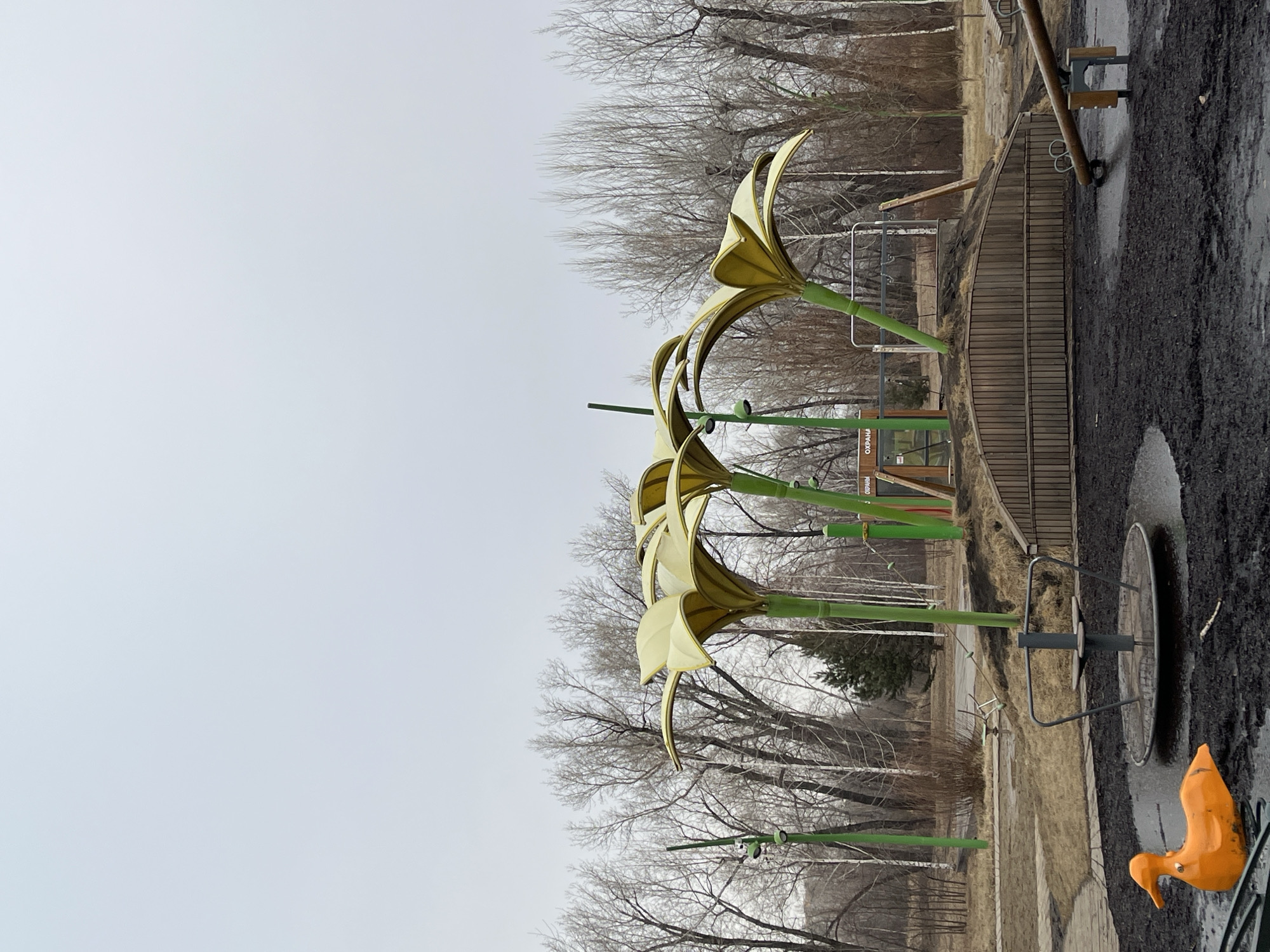 The image depicts a playground in Krasnoyarsk, Russia. Several stylized metal flowers with gold petals and green stems stand prominently. Behind the flowers is a backdrop of bare trees, typical of late autumn or early spring. To the right of the flowers, there is a wooden ramp and some playground equipment, including a rotating platform with a duck-shaped seat attached to it. The ground appears to be partially paved with asphalt and partially covered with dirt or mulch. The sky is overcast, suggesting a cool and potentially damp day.