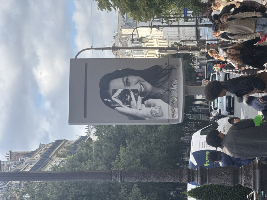 The image depicts a bustling street scene in Paris, France, characterized by its distinctive Haussmannian architecture and urban infrastructure. Central to the frame is a vertical, rectangular grey street sign panel featuring a black and white poster. The poster displays a smiling woman with long, dark hair, wearing a necklace. Her left eye is partially obscured by a hand holding a small, fractured, reflective object that distorts the reflection of an eye. A tattoo, possibly "23," is visible on the base of the hand's thumb. Below the image, the hashtag "#HUMANUMANITY" is printed. To the immediate left, a dark, ornate cast-iron lamppost with intricate carvings extends vertically. The background is dominated by multi-story Parisian apartment buildings constructed of light-colored stone, featuring iron balconies and mansard roofs. Green foliage from trees is visible along the street, which is illuminated by an overcast sky with patches of blue. In the midground, multiple pedestrians, diverse in appearance, occupy the sidewalks, engaged in walking. A white commercial van with "supervan" branding is visible on the street, alongside other cars. One individual in the foreground is holding a green skateboard. Further down the street on the right, another ornate street lamp is present, and a street sign partially reads "RUE DE ROME," confirming the specific location within the city.