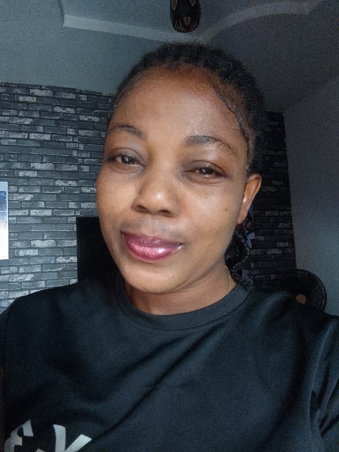 A headshot-style portrait depicts an adult female of African descent, centrally framed and looking directly into the camera