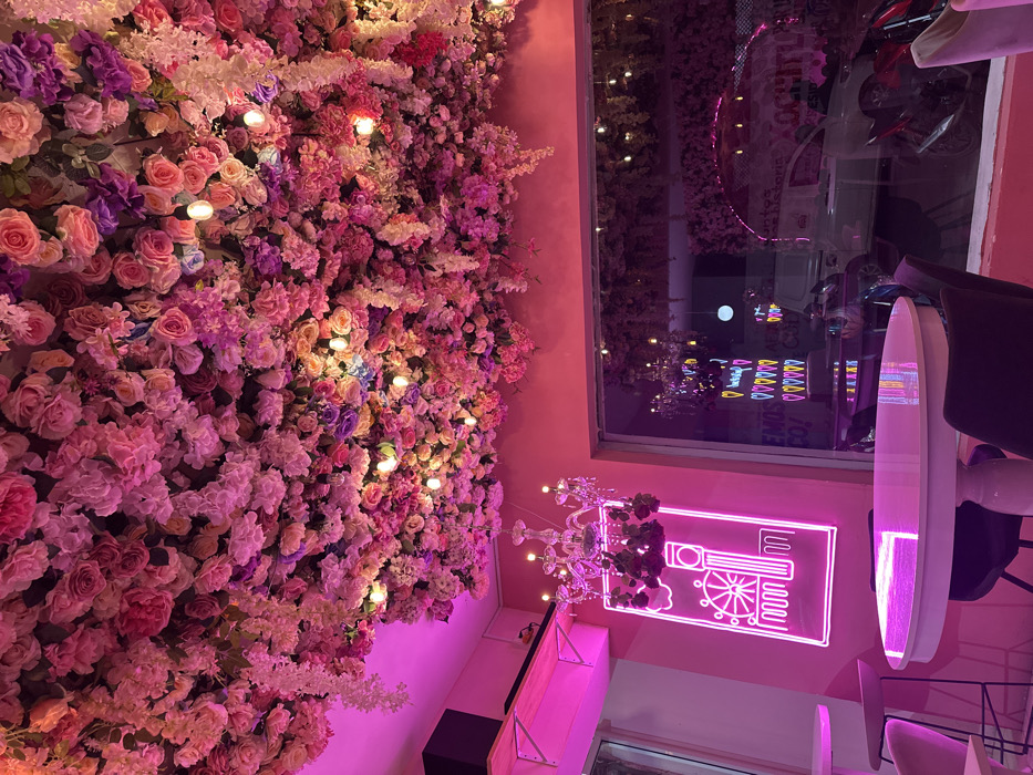 This image captures the interior of a commercial establishment, identified as Xochitláli Café in Tuxtepec, Oaxaca, Mexico. The ceiling is densely covered with artificial flowers, primarily pink, fuchsia, and purple roses, complemented by white and light pink wisteria-like floral cascades. Numerous small, spherical light bulbs emitting a warm glow are embedded throughout the floral ceiling. The interior walls are painted pink, illuminated by a pervasive magenta ambient light. A crystal chandelier, featuring multiple arms and lights, is suspended from the floral ceiling in the mid-ground, with dark floral or leaf accents. Directly below the chandelier, on a pink wall, a bright pink neon sign depicts the outlined shapes of a Ferris wheel and a tall, stylized architectural structure, possibly a clock tower. In the foreground and mid-ground, multiple white round tables with central pedestal bases are arranged. The nearest table is surrounded by dark-colored upholstered chairs, two of which are visible. To the far left, a high-top table and stools are partially visible. A black rectangular object rests on a light-colored wooden shelf mounted on the upper left wall. A large glass window or storefront on the right side of the image offers a view of an exterior street scene, partially obscured by reflections of the interior chandelier and neon sign. The outdoor environment includes a street with parked or moving vehicles, specifically a white van and a red and black motorcycle. Across the street, another building or wall is adorned with greenery and floral decorations, along with additional lights. Reflected text on the window glass, originating from signs across the street, includes phrases such as "XOCHITL" and "JUNTOS POR LA HISTORIA." No individuals are present in the image.