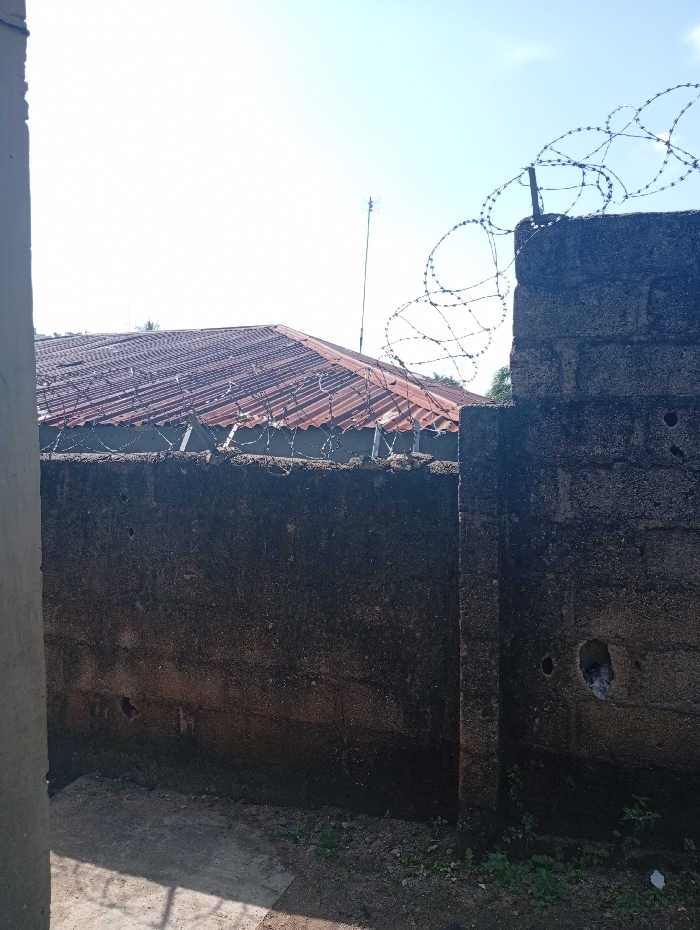 The image displays an outdoor scene in Madalla, Nigeria, primarily featuring a weathered concrete block wall