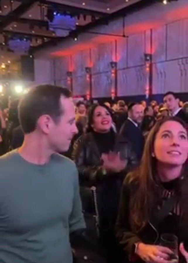 group of three people standing in a large room, seemingly at an event. The man on the left is wearing a green sweater and looking towards the camera, then to his right. The woman in the middle is wearing a black leather jacket and clapping her hands, smiling and looking upwards. The woman on the right is wearing a black jacket and holding a glass, looking upwards as well. The room is crowded with other people in the background, some in suits and dresses. The lighting is a mix of white, red, and blue, creating a festive atmosphere. There are chandeliers on the ceiling and patterned panels on the walls. There is some indistinct audio of cheering and a woman speaking.