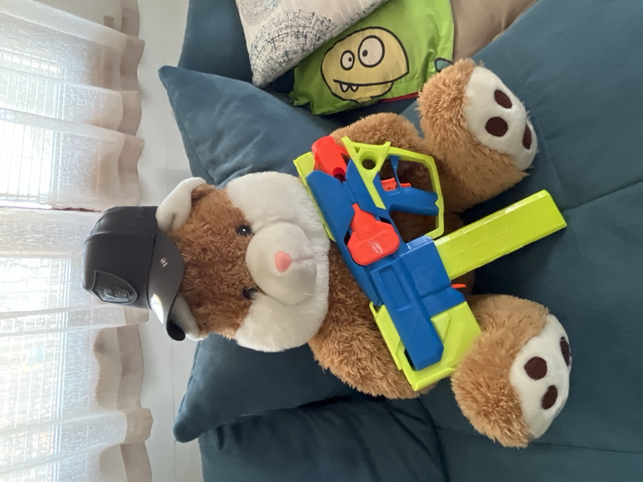 This image captures an indoor scene in the city of Sheynovo, Bulgaria, featuring a large stuffed animal on a sofa. The central subject is a brown and white stuffed animal, resembling a hamster or teddy bear, seated upright. It wears a dark grey or black baseball cap, angled backward, with a visible shield-like logo on the front. The stuffed animal holds a multi-colored toy blaster, primarily blue and neon yellow-green with orange accents, bearing the "NERF" brand name on its side. It is positioned on a dark teal upholstered sofa, which also supports a matching dark teal pillow behind the stuffed animal. To the right, a white pillow with a textured grey pattern rests on the sofa, partially obscuring a bright green item with a yellow cartoon character design. In the background, a window covered by translucent light-colored sheer curtains allows diffused daylight into the room.