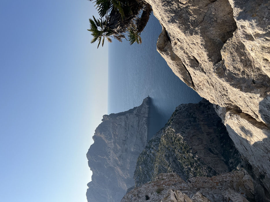 The image displays a rugged coastal landscape at Cap de Formentor, within the municipality of Pollença, Mallorca, Spain. The foreground features fragmented, light-colored rock formations on the lower left and right. A small palm-like plant with green fronds protrudes from the cliff edge on the far right. The midground reveals a deep, narrow cove with dark blue water, flanked by steep, vegetated cliffs. In the background, a prominent, grey rocky headland extends into the open Mediterranean Sea from the left, creating a distinct point. The sea stretches to a clear, light blue horizon under an unclouded sky. No individuals, animals, or man-made objects are present. Sunlight illuminates the scene, casting shadows on the textured rock surfaces.